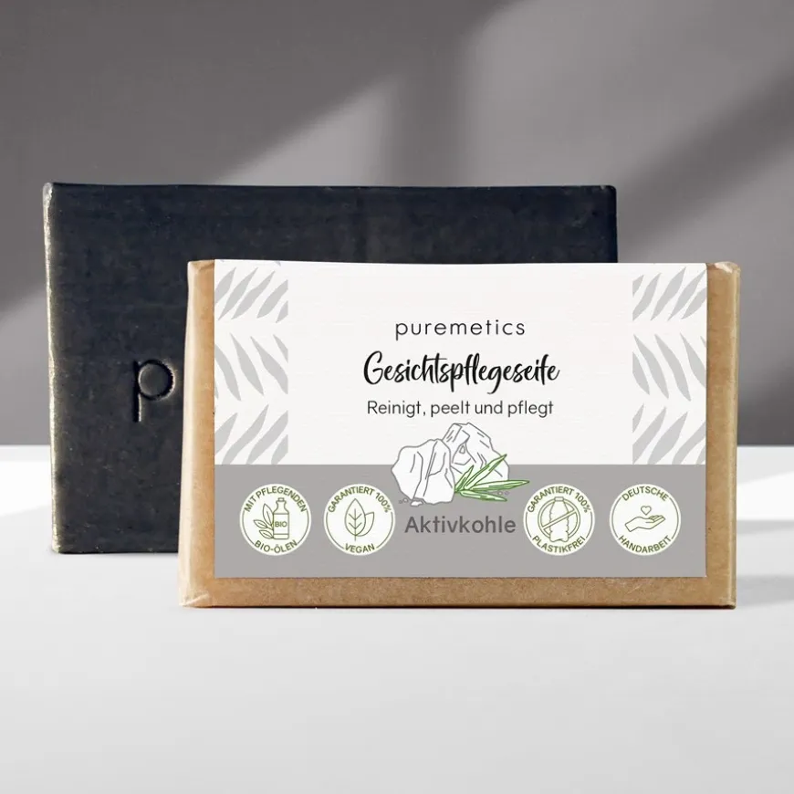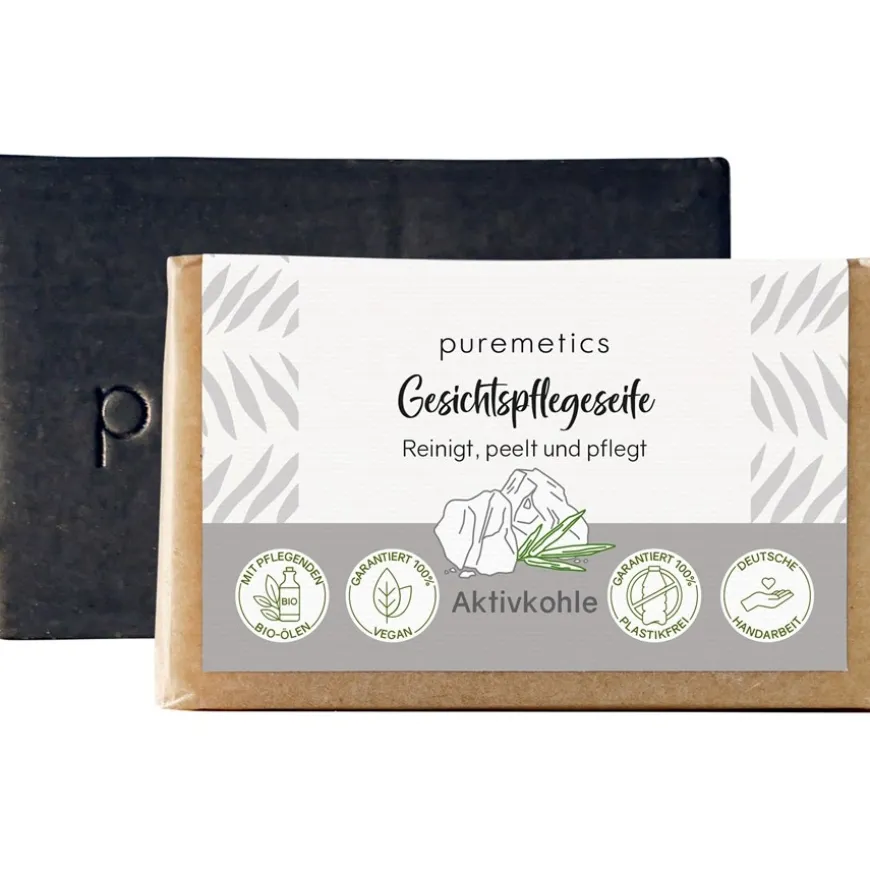 Biologische babassu-olie en biologische jojoba-olie voorzien de huidcellen van voedende lipiden, terwijl de groene klei verantwoordelijk is voor het zachte exfoliërende effect tijdens het gebruik. De munt in de zeep ruikt niet alleen heerlijk. Het heeft ook een ontstekingsremmend effect op de huid en werkt kalmerend. Om te gebruiken laat je de actieve houtskool gezichtszeep eerst goed schuimen met warm water en verdeel je het vervolgens over de gezichtshuid. Wacht een minuut voordat je de zeep weer afspoelt, zodat de waardevolle ingrediënten de tijd hebben om in te werken.Goed om te weten: Je vindt meer geweldige natuurlijke zepen van puremetics voor een aangename huidverzorging in onze shop. Dit zijn bijvoorbeeld de Mediterrane gezichtsverzorgingszeep, de Vanille hand- en doucheverzorgingszeep, de Tropical kinderzeep en de Grapefruit Cypres haarzeep.