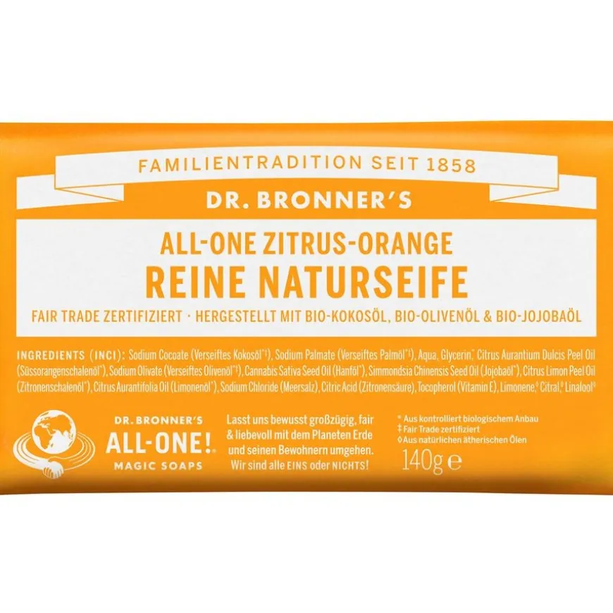 Met Dr. Bronner’s All-One citrus-sinaasappel zuivere natuurzeep kunt u tussendoor uw lichaam en geest verfrissen. De heerlijke geur van de zeep doet denken aan de zomer en maakt van de dagelijkse reiniging een sprankelende ervaring. De basissamenstelling van de zeep bestaat uit een combinatie van biologische kokos-, palmpit-, olijf-, jojoba- en hennepolie. Hieraan is voor deze zeep essentiële biologische citrus-sinaasappelolie toegevoegd.