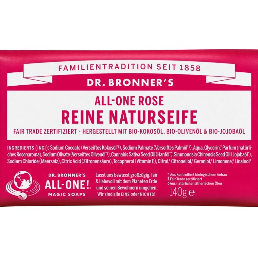 De Dr. Bronner’s All-One Rose zuivere natuurzeep is iedere dag weer een weldaad voor lichaam en geest. De lichaamsverzorgingszeep bestaat, zoals alle zuivere natuurzepen van de fabrikant, uit een basis van biologische olijf-, kokos-, hennep-, jojoba- en palmpitolie en is verfijnd met natuurlijke rozengeur. Terwijl palmpitolie voor de stevige textuur van de zeep zorgt, creëert de verfijnde kokosolie een zijdezacht schuim dat uw huid zacht en natuurlijk reinigt, zonder deze vettig te maken.