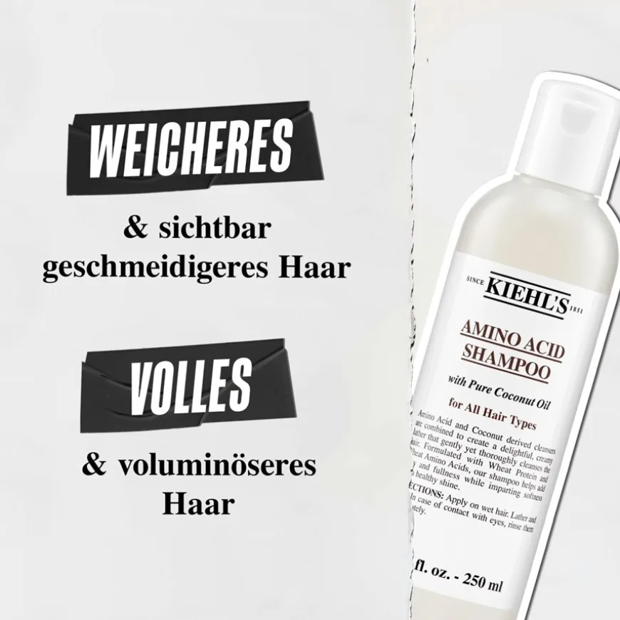 Kiehl’s presenteert de Amino Acid Shampoo voor een milde haarspoeling voor alle haartypes. De formule met aminozuren en kokosolie reinigt het haar op milde wijze. Tijdens het aanbrengen ontstaat een rijk, romig schuim dat zorgt voor een aangename waservaring. Na het wassen kan het haar er gladder en voller uitzien met een natuurlijke glans. De ingrediënten voor deze shampoo zijn op verantwoorde en duurzame wijze verkregen.