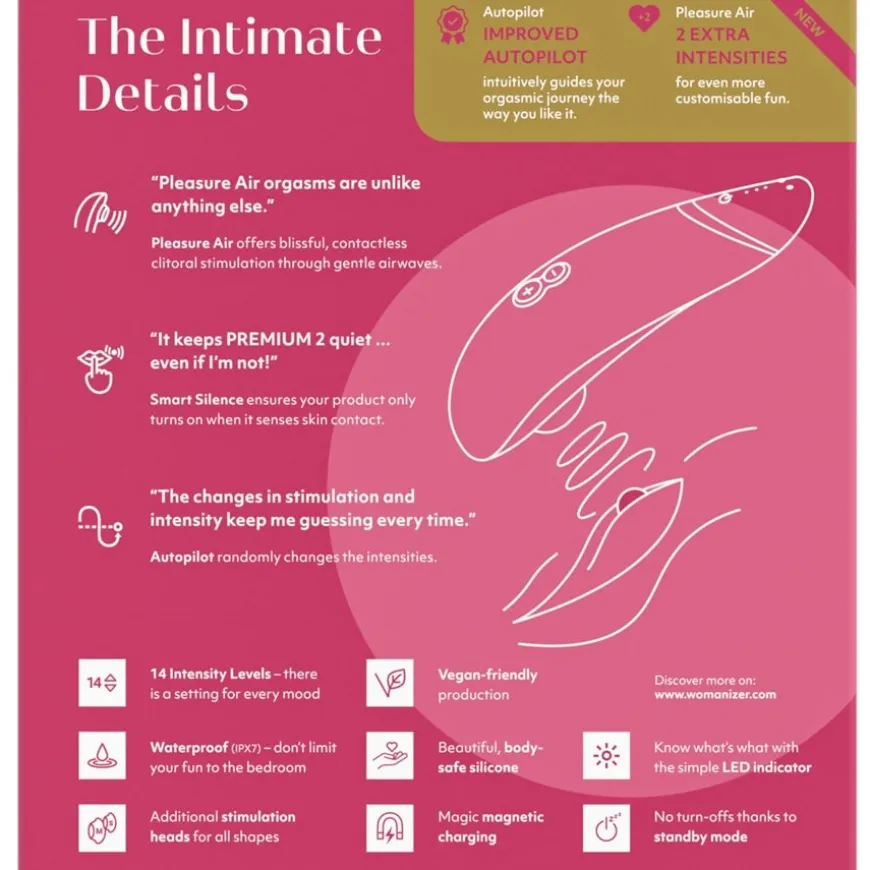 Gewoon achterover leunen en je laten verrassen? Met Womanizer PREMIUM 2 wordt me-time sensueel en ontspannen! De verbeterde automatische piloot begeleidt je genot en verrast je met 14 intensiteitsniveaus – afhankelijk van je stemming. Het belangrijkste kenmerk van dit speeltje is ook de gepatenteerde Pleasure Air Technologie, die de clitoris volledig contactloos masseert met zachte luchttrillingen. Het resultaat: ongekende orgasmes. De Smart Silence-functie zorgt voor een bijzonder discrete time-out. Dit betekent dat de PREMIUM 2 alleen start als hij in contact komt met de huid. Als je het speeltje weghaalt, valt het stil. Dankzij de LED communicatie is het bedienen van de clitorisstimulator makkelijker dan ooit, omdat het laat zien in welke modus je bent en wat het batterijniveau is,