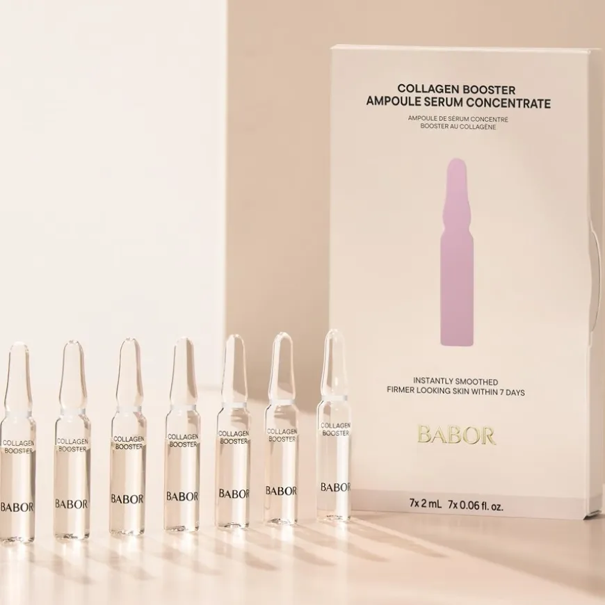 De Ampul Concentraten Collageen Booster 7 Ampullen van BABOR helpen de huideigen collageenstructuren op te bouwen en te onderhouden. Ze optimaliseren de vochtbalans van de huid, maken haar voller en gladder. De formule is geschikt voor alle huidtypes, vooral voor de rijpere en veeleisende huid. Breng de inhoud van één ampul dagelijks aan op een schone huid van gezicht, hals en decolleté. Geniet van een heerlijk gladde, vollere en jeugdig frisse huid!