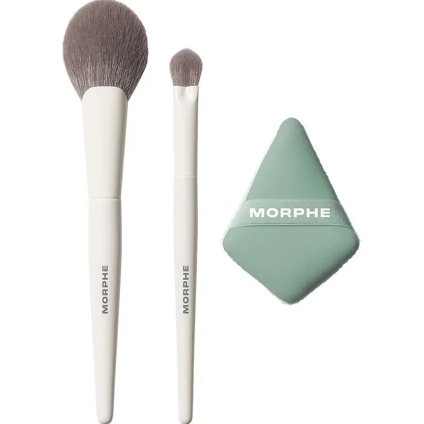 Morfe gezichtskwastensets zoals de Conceal & Set Tool Trio helpen je om de kwaliteit van je make-up naar een hoger niveau te tillen. Deze set make-up tools bestaat uit een concealerkwast, een poederkwast en een poederspons die aan beide kanten gebruikt kunnen worden. Gebruik de Paddle Powder Brush M163 om losse gezichtspoeder aan te brengen op het voorhoofd, de kin, de wangen en de neusbrug. Voor creamy en vloeibare concealer kun je de Slanted Concealer Brush M135 gebruiken. Het mengt de vloeistoffen perfect en geeft je gezicht een harmonieuze omlijsting. De To the Point Dual-Sided Powder Puff is geschikt voor elke poedertextuur en bereikt dankzij de taps toelopende vorm aan beide zijden ook delen van de huid die moeilijk te bereiken zijn met vergelijkbare sponsjes. Dankzij de speciale, zijdezachte band kan de spons precies over de gezichtshuid worden geleid.