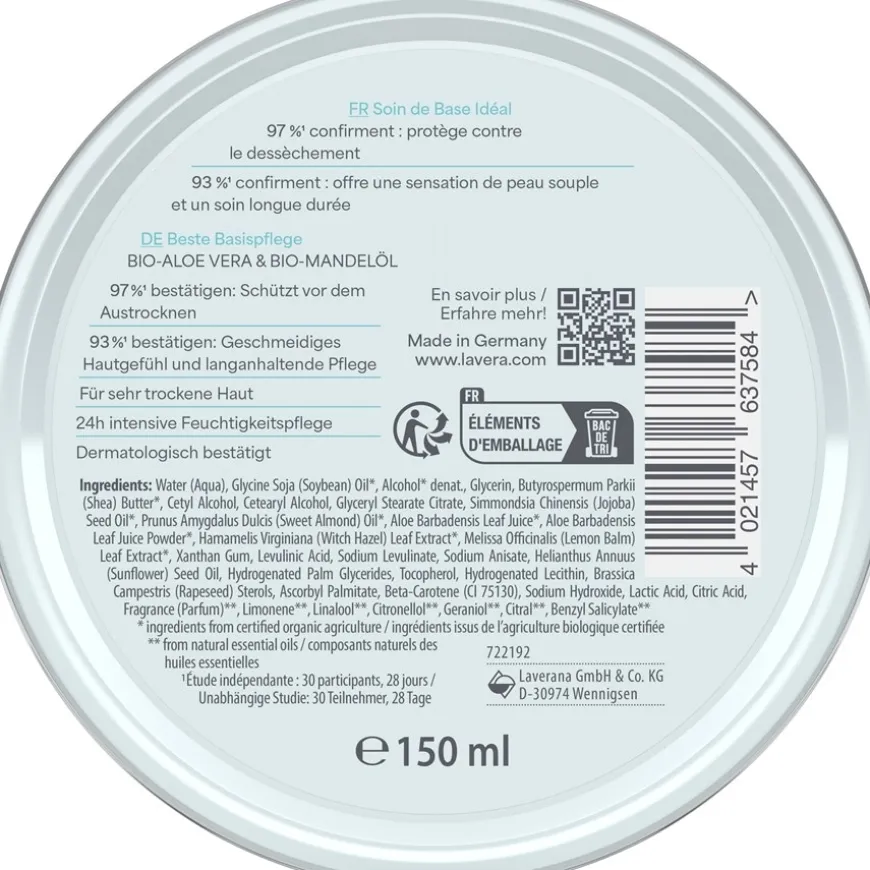 De rijk voedende crème van biologische aloë vera & biologische amandelolie uit de Basis Sensitive huidverzorgingslijn is perfect afgestemd op de behoeften van de bijzonder droge en gevoelige huid. Aloë vera van biologische teelt voorziet de huid van intensief vocht en scoort met talrijke voedingsstoffen zoals vitaminen, mineralen, polysachariden en aminozuren. Biologische amandelolie ondersteunt de natuurlijke balans van de huid en laat haar soepel en zacht aanvoelen. De heerlijk naar amandelen geurende crème is ideaal voor de dagelijkse gezichtsverzorging. De hydraterende huidverzorging kan echter ook gebruikt worden voor droge lichaamsdelen zoals ellebogen of handen. De vegan biologische aloë vera & biologische amandelolie crème werd door PETA Duitsland onderscheiden met de Vegan Beauty Award 2021.