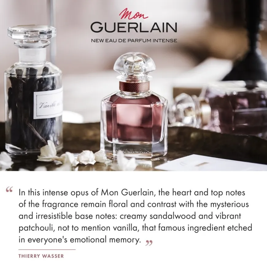 De Mon GUERLAIN Eau de Parfum Spray Intense is een houtachtig-amberachtige compositie die sinds 2019 de wereld van geuren verrijkt. Deze intense interpretatie wordt gekenmerkt door een bijzondere diepte en sensualiteit. De opening is fris met een combinatie van lavendel, pittige mandarijn en bergamot. In het hart van de creatie ontvouwt zich de warmte van een dubbele portie Tahitiaanse en Madagaskar vanille, elegant omringd door poederachtige iris en een bloemig boeket van Sambac jasmijn en roos. Noten van Australisch sandelhout, aardse patchoeli, cumarine, zoethout, benzoë en zachte witte muskus zorgen voor een langdurige en complexe basis. De geur wordt gepresenteerd in de karakteristieke “quadrilobé” flacon, waarvan het ontwerp wordt versterkt door een luxe glazen gewicht en kopergouden accenten.