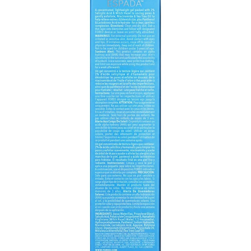 – Breng een dun laagje van de gel direct op de onzuiverheden aan en laat het inwerken tot het volledig is geabsorbeerd. Het aanbrengen met het FOREO ESPADA™ apparaat versterkt het effect.