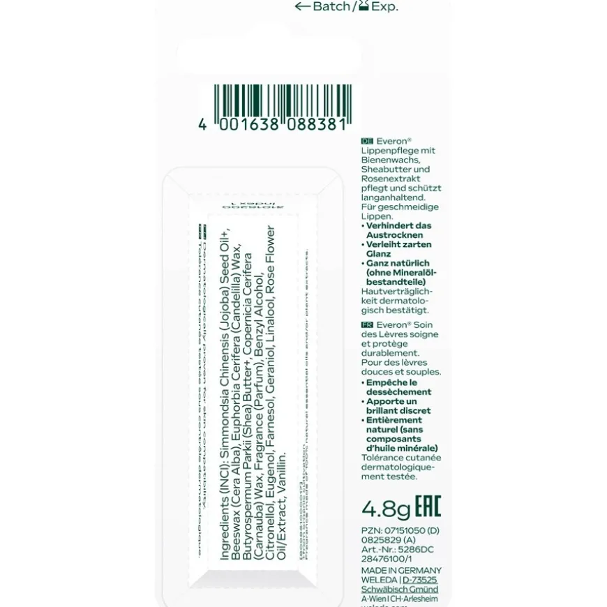 Dankzij de milde formule is Weleda Everon Lip Care met SPF 4 ook geschikt voor de gevoelige huid. Het bevat zorgvuldig geselecteerde plantenextracten zoals sheaboter, candelilla en rozenwas. Het is ook verrijkt met vochtinbrengende jojoba-olie. Deze vloeibare was beschermt de lippen tegen vochtverlies zonder ze vet te maken. Jojoba-olie wordt zeer goed verdragen en is daarom een favoriet verzorgingsproduct voor alle huidtypes – vooral voor de droge huid. Weleda Everon Lip Care in praktische stickvorm kan naar behoefte meerdere keren per dag op de lippen worden aangebracht. Het is een ideale make-upbasis voor gekleurde lippenstift. Verheug je op een gevoede en fluweelzachte huid die optimaal gehydrateerd is.