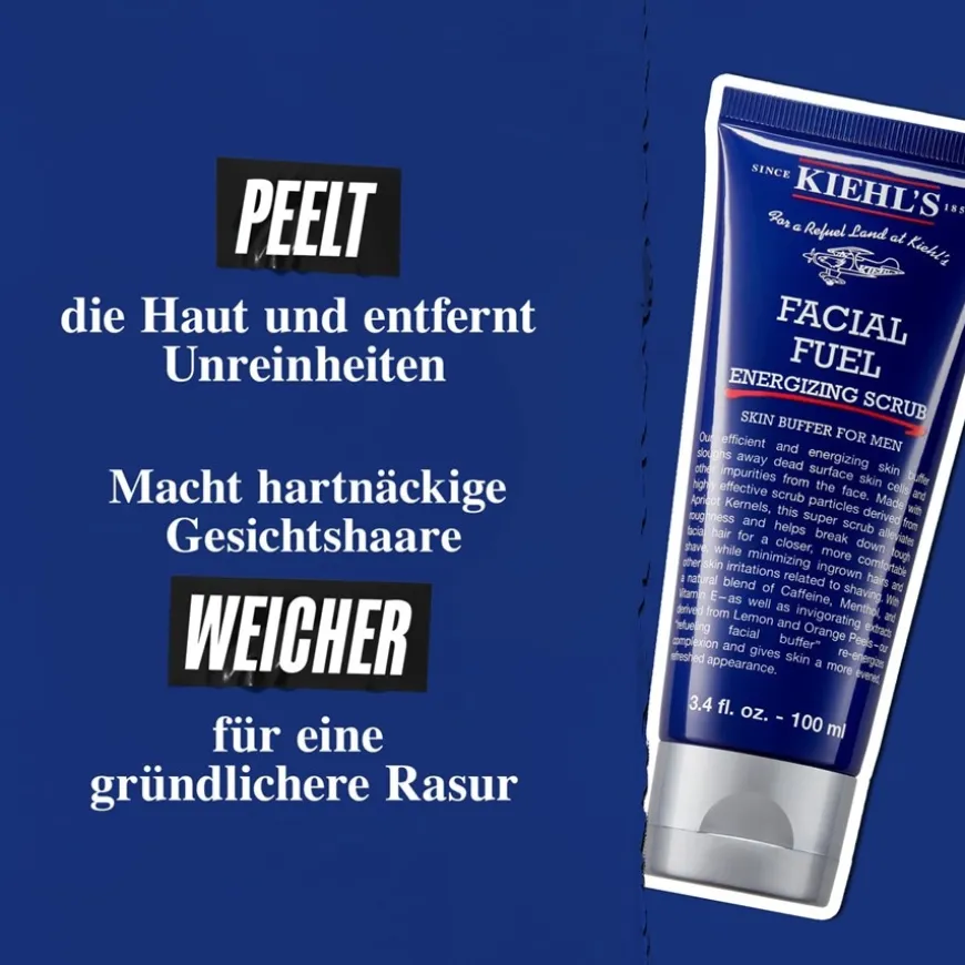 De Facial Fuel Energising Scrub van Kiehl’s is ontwikkeld om het huidoppervlak te verfijnen. De formule met abrikozenpitpoeder zorgt voor een mechanische exfoliatie die dode huidcellen en onzuiverheden op milde wijze verwijdert. Verrijkt met cafeïne, menthol en vitamine E, geeft het aanbrengen de huid een verfrist en gerevitaliseerd gevoel. De romige textuur bereidt de huid ook optimaal voor op een glad scheerresultaat door de baardharen te verzachten. Citrusextracten van citroen en sinaasappel ronden de samenstelling af en geven de scrub zijn karakteristieke, revitaliserende geur. Bij regelmatig gebruik wordt de teint helderder en voelt de huid gladder aan.