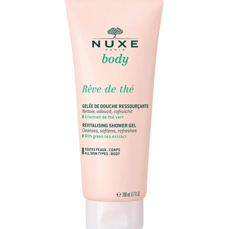 De revitaliserende douchegel Gelée de Douche Ressourcante van het merk Nuxe reinigt de huid zacht en grondig. Rêve de Thé, een droom van groene thee-extract, vormt een perfecte harmonie met de plantaardige reinigingsbasis. De subtiel smeltende textuur creëerteen sensueel schuim op de huid dat gemakkelijk af te spoelen is. Gelée de Douche Ressourcante reinigt de huid tot diep in de poriën en laat een onweerstaanbare geur van groene thee achter met verfrissende noten van rabarber en verse kruiden.