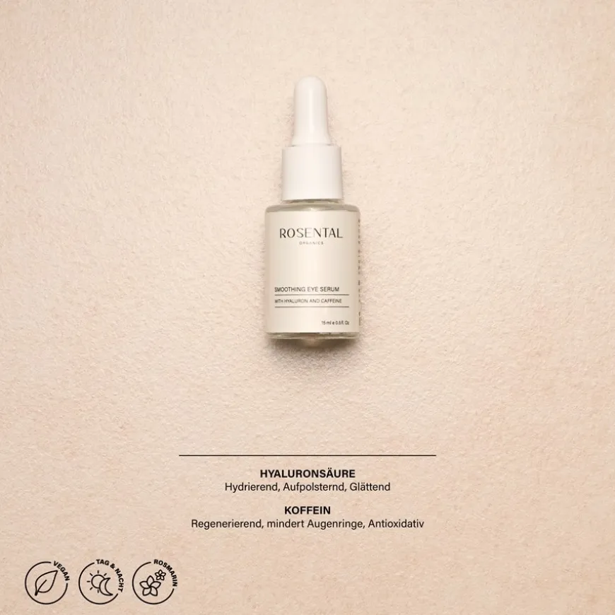 Het Smoothing Eye Serum is een waardevol gezichtsverzorgingsproduct van Rosental Organics. Deze Smoothing Eye Care maakt indruk met een duo boost effect: opvullende cafeïne en hyaluronzuur maken de fijne huid onder de ogen glad en verminderen het ontstaan van donkere kringen.