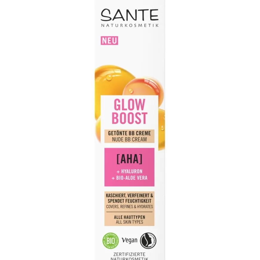 Waardevolle extracten en oliën van zonnebloemen, voedende sheaboter en hydraterende kracht van aloë bieden hoogwaardige huidverzorging met natuurlijke ingrediënten. De formule van Sante Naturkosmetik bevat ook hyaluronzuur en melkzuur, AHA-fruitzuren, glycerine en de antiverouderingsexpert vitamine E. Een geweldige cocktail voor een vitale en goed gehydrateerde huid! Ook veganisten waarderen het verzorgingsproduct, dat vrij is van dierlijke ingrediënten. Natuurlijk biedt het aangenaam geurende BB product ook gecertificeerde biologische kwaliteit. Probeer nu de zacht dekkende GlowBoost getinte BB cream en laat je betoveren door de natuurlijke uitstraling en zachte gloed!