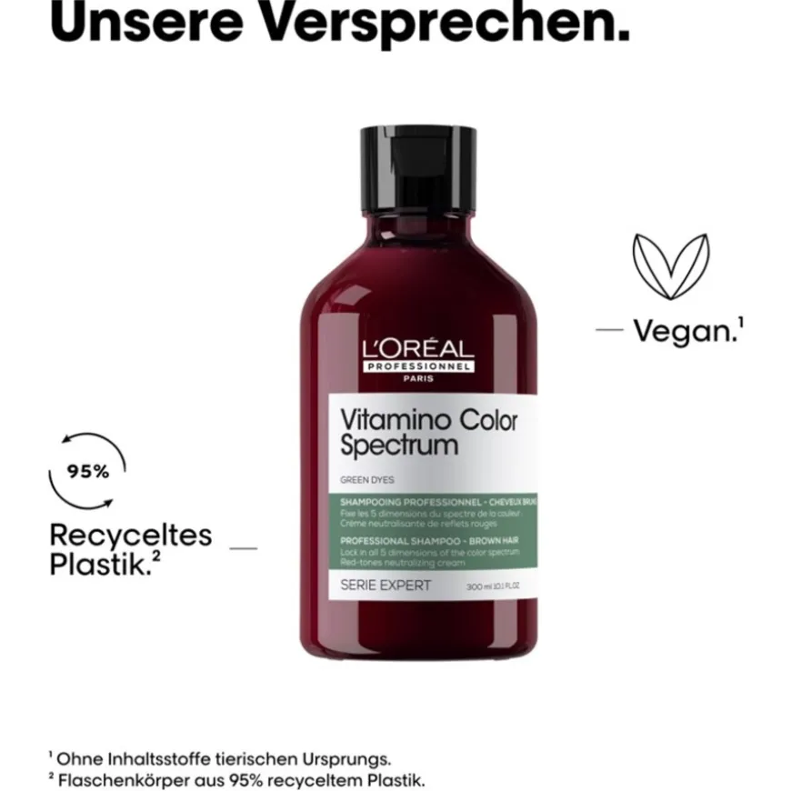 Het verzorgingsproduct uit de Expert Vitamino Color Spectrum-lijn, dat geschikt is voor alle haartypes, moet twee tot vijf minuten op nat haar worden aangebracht. De vegan hair care van het cosmeticahuis L’Oréal Professionnel Paris kan daarna worden uitgespoeld met veel water. Zelfs gekleurd en chemisch behandeld haar kan baat hebben bij een reiniging met de Green Dyes Neutralizing Shampoo uit het Expert Vitamino Color Spectrum assortiment. Dit haarverzorgingsproduct beschermt je haarkleur gedurende vele dagen.