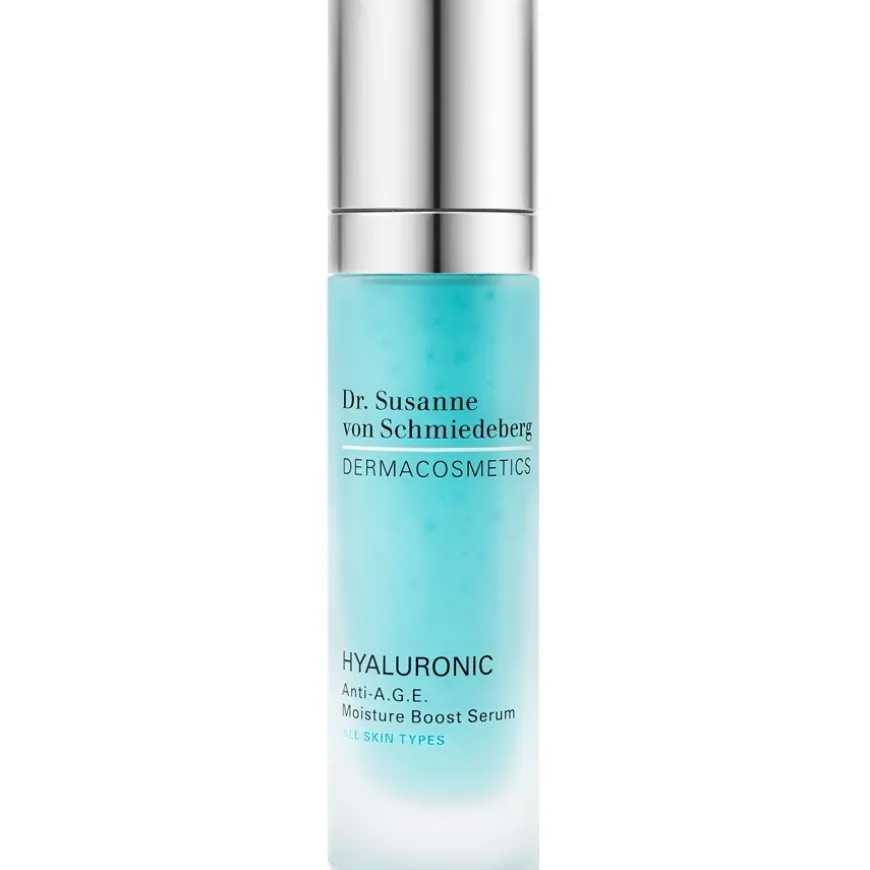 in de toekomst – maar niet met verschillende serums en oliën! Een product als het Hyaluronic Anti A.G.E Moisture Boost Serum van Dr Susanne von Schmiedeberg kan meerdere functies tegelijk vervullen en je verwennen met effecten als meer frisheid, jeugdige uitstraling en een versterkte huidbarrière. De actieve ingrediënten zijn verschillende soorten hyaluronzuur, een hydro-tripeptide, vitaminen en een zeekraal-extract. Hyaluronzuur hydrateert je huid, terwijl de tripeptide de huideigen productie van hyaluronzuur verder stimuleert. De vitaminen voeden de huid en beschermen haar tegen invloeden van buitenaf die haar kunnen beschadigen. Het salicornia-extract bevordert de productie van ureum, dat ook een rol speelt in de vochtbalans van de huid. In plaats van veel serums en oliën te combineren, kun je alleen vertrouwen op het Hyaluronic Anti A.G.E Moisture Boost Serum!