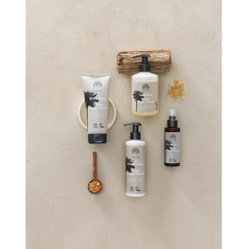 en elkaar aanvullen in hun werking. De lichte formule wordt snel opgenomen en is geschikt voor de normale en droge huid.De abrikozenpitolie in de Hydraterende Body Lotion heeft een beschermende en gladmakende werking. Het wordt zeer goed verdragen en is mild, herstelt de natuurlijke vochtbalans van de huid en is daarom een perfecte olie voor huidverzorging. Urtekram heeft karitéboter toegevoegd aan de formule, die een intens voedende, huidverstevigende en verzachtende werking heeft. Het voorziet je huid van antioxidanten en vitamine A en E, die ook in grote hoeveelheden voorkomen in jojoba-olie. Dankzij deze olie versterkt de Hydraterende Body Lotion Sweet Ginger Flower de weerstand van je huid, houdt het haar soepel en maakt het haar oppervlak glad. In combinatie met de olijfolie die het bevat, verhoogt het verzorgingsproduct het vochtgehalte van je huid en voorkomt zo jeuk door uitdroging.