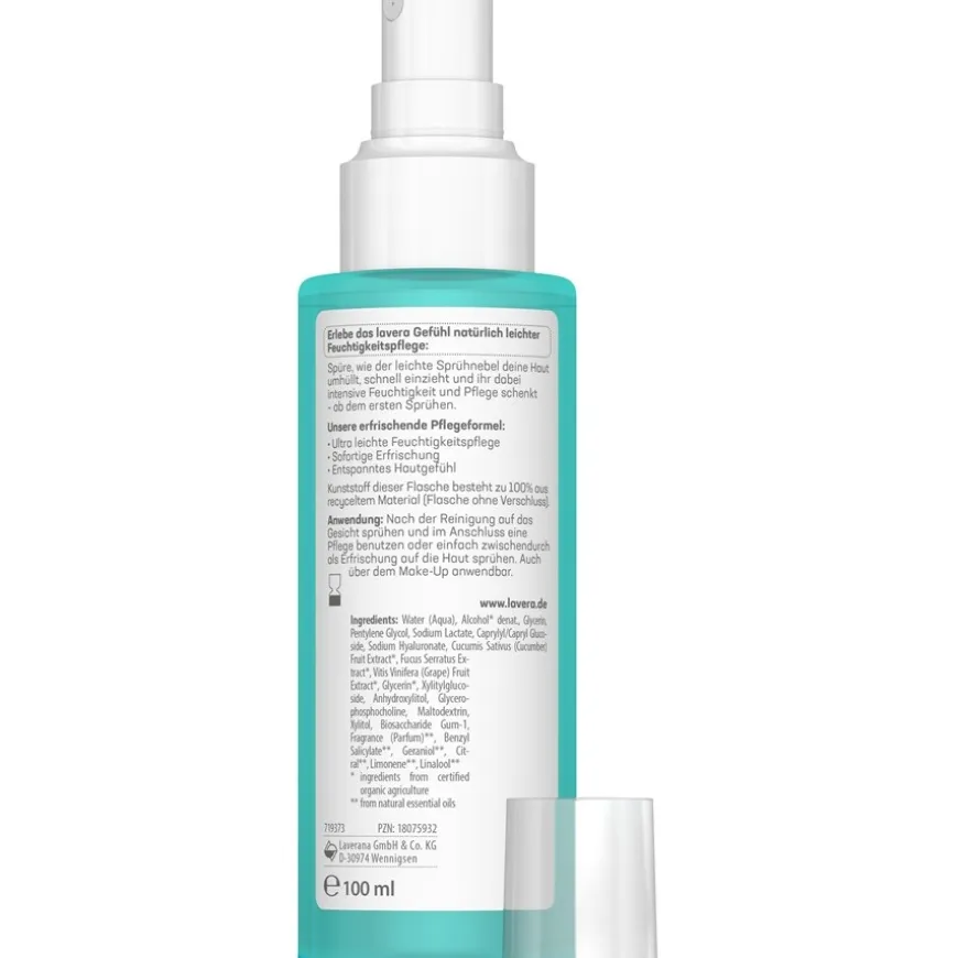 De Lavera gezichtsverzorgingsspray is zowel geschikt als dagverzorging als voor een snelle verfrissing onderweg. De lichte spraynevel omhult de gezichtshuid, wordt snel opgenomen en voorziet de huid van belangrijke verzorgende stoffen en nieuw vocht. Het is een veganistische, NATRUE gecertificeerde natuurlijke cosmetica met een biologisch afbreekbare formule zonder minerale oliën en kunstmatige kleur-, geur- en conserveringsmiddelen. De fles (zonder dop) is gemaakt van 100% gerecycled materiaal. Spray de huidverzorging op je gezicht na het reinigen en gebruik daarna eventueel een vochtinbrengende crème. Je kunt de dagverzorging ook gewoon op je huid sprayen voor een verfrissende traktatie tussendoor – zelfs als je make-up draagt.