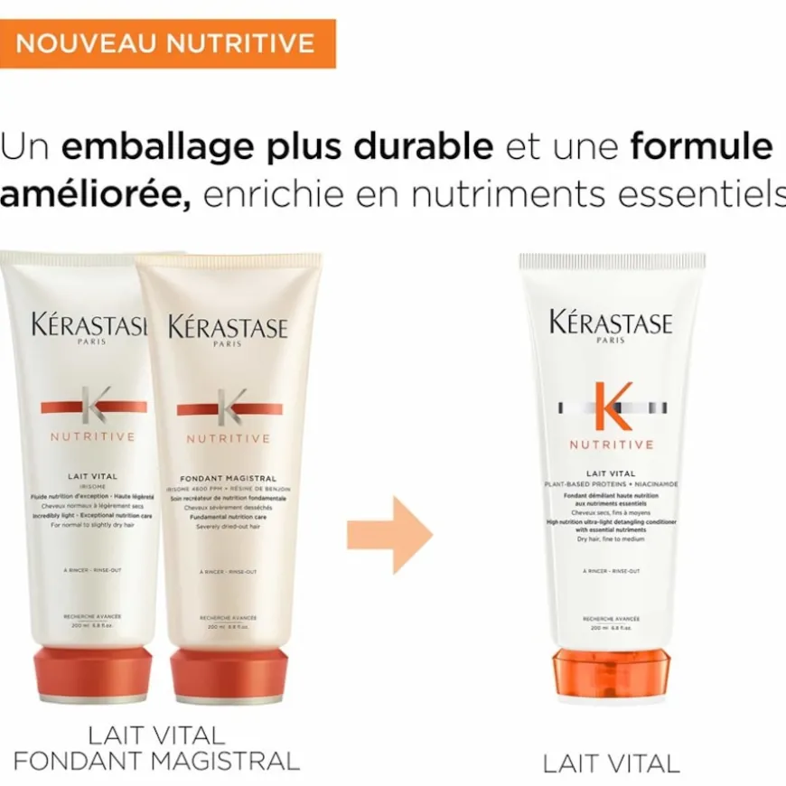 Als hydraterende conditioner hydrateert Nutritive De Lait Lotion het haar intensief en bevordert het vasthouden van vocht diep onder de hoofdhuid. Het bestaat uit plantaardige proteïnen en niacinamide. De proteïnen egaliseren poreuze en beschadigde structuren en versterken de natuurlijke hydrolipidenbarrière en beschermen tegen invloeden van buitenaf. Niacinamide heeft een antioxiderende, kalmerende en talgregulerende werking. De Lait Vital Lotion van Kérastase verbetert ook aanzienlijk de combabiliteit.Deze conditioner bevat lichte texturen die het haar niet verzwaren, waardoor het fluweelzacht aanvoelt en een krachtige glans krijgt. De conditioner heeft een korte inwerktijd nodig, wordt extreem snel opgenomen en kan worden uitgespoeld zonder residu achter te laten voor luchtig en licht vallend haar. Bovendien wordt Kérastase Nutritive Lait Vital Lotion vergezeld door een sensuele geur die het haar verwent met een vleugje luxe.