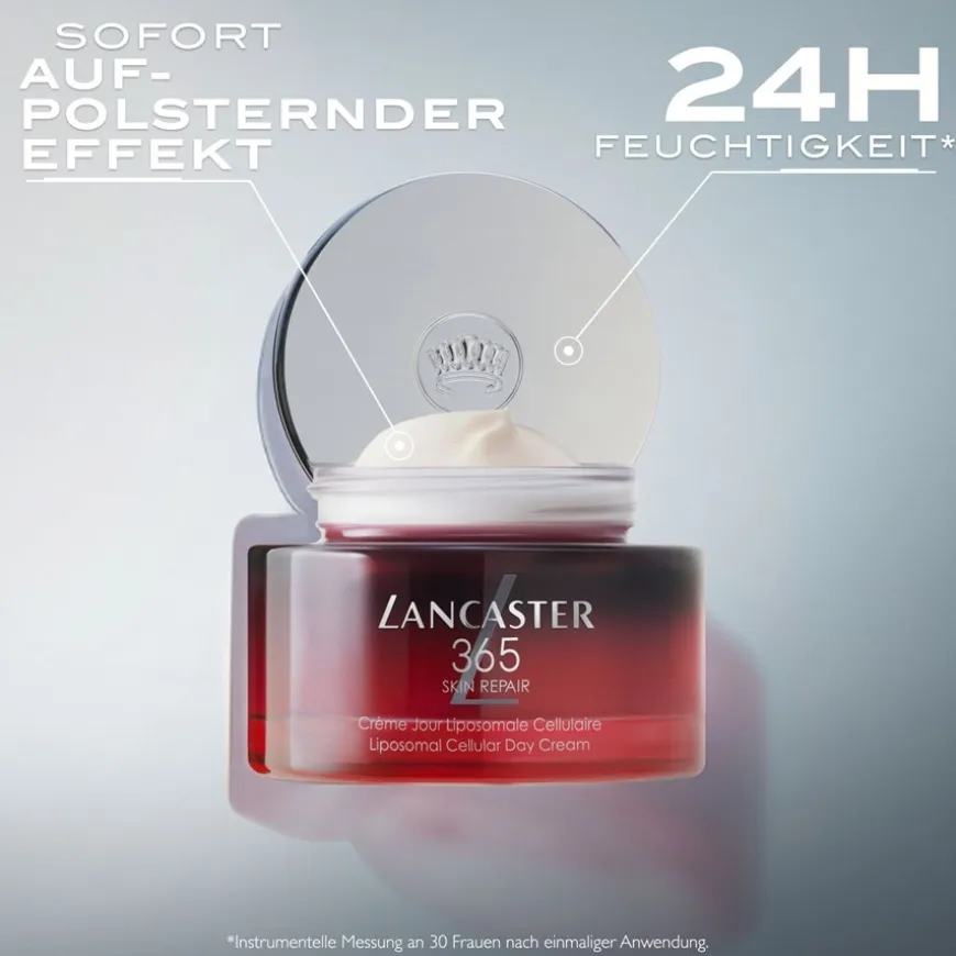 De unieke herstelactivator van de Lancaster 365 Skin Repair Liposomal Cellular Day Cream werkt met geavanceerde enzymen, terwijl intelligente hyaluronzuurmoleculen de huid voorzien van veel vocht. Ze zijn ook in staat om de eerste tekenen van veroudering te herstellen door expressielijntjes en rimpels op te vullen. Hierdoor ziet de huid er direct na het aanbrengen van het verzorgingsproduct verfrist en verjongd uit. In de laatste stap creëert de crème een onzichtbaar beschermend schild over de huid, waardoor deze zich beter kan verdedigen tegen milieuvervuiling, vrije radicalen en andere stress. Idealiter wordt deze dagcrème gecombineerd met zijn tegenhanger, de nachtcrème uit het assortiment.