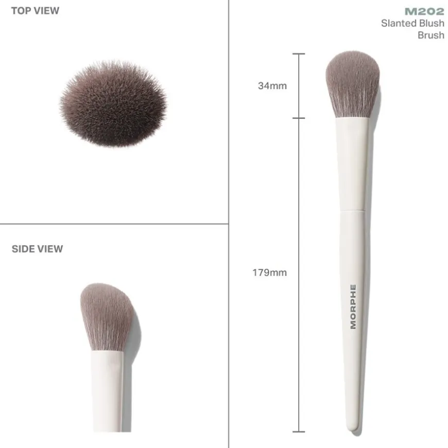 De M202 Slanted Blush Brush van Morphe maakt deel uit van een set hoogwaardige gezichtskwasten waarmee je blush en andere make-up nauwkeurig kunt aanbrengen. In deze versie helpt de gezichtskwast met zijn ronde vorm bij het netjes en gelijkmatig aanbrengen van blush langs de jukbeenderen.