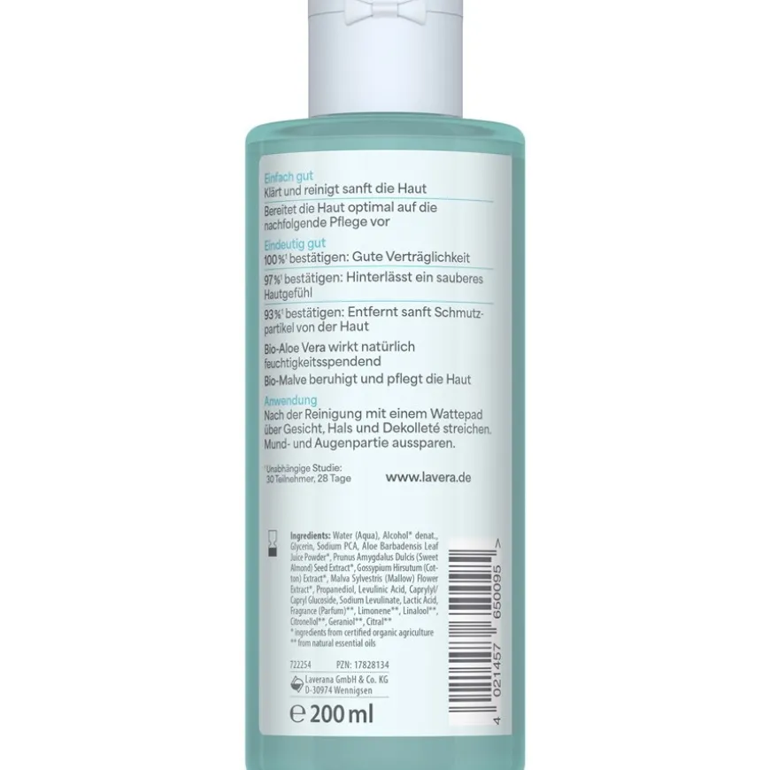 Geen compromissen met dit gezichtsverzorgingsproduct. Het huidverzorgingsproduct met biologisch afbreekbare formule is vriendelijk voor de huid en het milieu. Biologische aloë vera bevat talloze voedingsstoffen en staat bekend om zijn verzachtende, hydraterende werking. Waardevol biologisch malve verzacht irritaties en voorkomt nieuwe huidirritaties. De milde gezichtstoner van Lavera reinigt en zuivert de huid op milde wijze. Gebruik ’s ochtends en ’s avonds na het reinigen. Breng wat milde toner aan op een wattenschijfje en veeg zachtjes over de huid van gezicht, hals en decolleté.