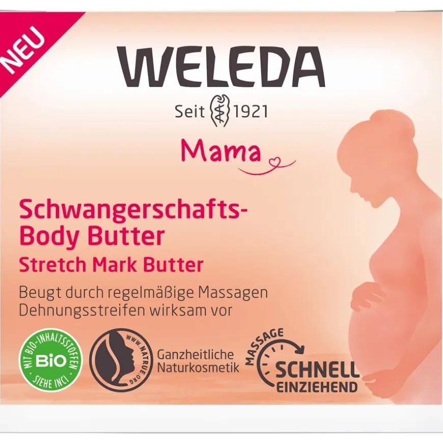 Tijdens de zwangerschap heeft de huid intensieve verzorging nodig. Wanneer de buikomvang toeneemt, wordt de huid extreem uitgerekt. Dit kan soms leiden tot lelijke striae. Maar dat hoeft niet het geval te zijn. Weleda heeft een heerlijke Pregnancy Body Butter ontwikkeld die de huid van je buik beschermt en ondersteunt. De effectieve huidverzorging Pregnancy Body Butter is perfect voor aanstaande moeders. Het bevat biologische sheaboter, tijgergasextracten, biologische cacaoboter en waardevolle voedende oliën. De subtiele geur van roos, mirre en neroli is zeer aangenaam.Toepassing:Masseer de zwangerschaps- en babyverzorging twee keer per dag in. Bijvoorbeeld voordat je je aankleedt en voordat je naar bed gaat.