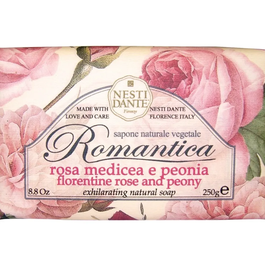 De Rose & Peony Soap uit de Romantica serie van Nesti Dante Firenze is verpakt in een prachtig papier dat met rozen is bedrukt.