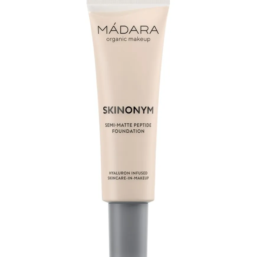 Skinonym is de perfecte mix van make-up en hoogwaardige huidverzorging. Hyaluronzuur, bosbessen- en pioenroosextracten hydrateren de huid en leveren belangrijke voedingsstoffen voor een gezond, stevig uiterlijk. Ze hebben ook een antioxiderende werking en voorkomen vroegtijdige huidveroudering. Plantaardige peptiden stimuleren de lichaamseigen collageenproductie, waardoor fijne lijntjes worden gladgestreken en de huid er jeugdig blijft uitzien. Skinonym Semi-Matte Peptide van MÁDARA geeft de huid een natuurlijke glans en een egale, frisse teint. De finish is zijdezacht en mat.