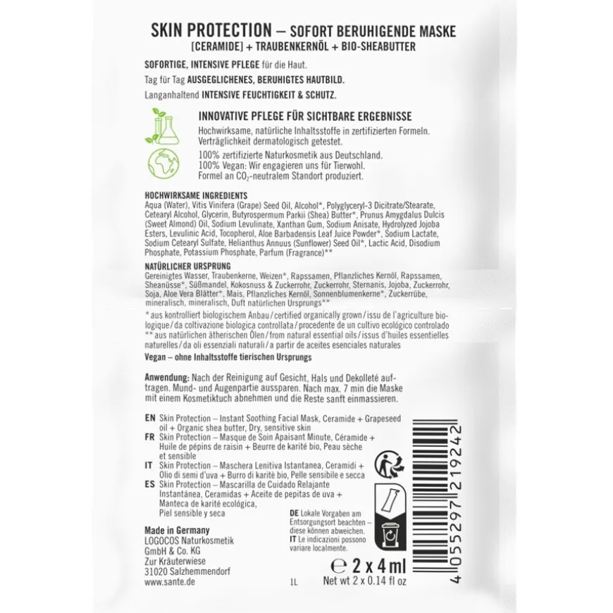 Net als de andere maskers van Sante Naturkosmetik scoort het Skin Protection Instant Soothing Mask met ceramiden, druivenpitolie & biologische sheaboter hoog met zijn plantaardige kracht van hoge kwaliteit. Druivenpitolie en voedende biologische sheaboter, evenals kostbare amandelolie, kalmeren en worden aangevuld met de bewezen huidverzorgende eigenschappen van ceramiden. Aloë vera-extracten zorgen voor extra vocht. De maskers van Sante Naturkosmetik zijn veganistisch en wreedheidsvrij. Ze bevatten ook geen kunstmatige geurstoffen. De natuurcosmetica-expert gebruikt essentiële oliën van planten. Trakteer je huid nu op een kleine spa met het kalmerende masker!
