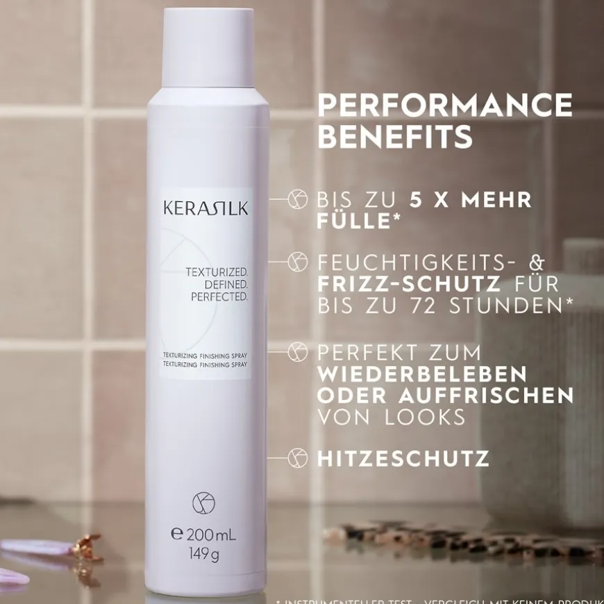 De nieuwe Texturising Finishing Spray van Kerasilk maakt indruk met zijn krachtige formule voor een geweldige look. De premium hairspray geeft je alles wat je haar nodig heeft voor dagelijkse styling: het definieert, texturiseert en perfectioneert slap haar voor een langdurige, flexibele fixatie van het kapsel. Dankzij Kerasilks unieke biomimetische zijde en kostbare blauwe lotusextract geeft deze styling spray je haar een natuurlijke, satijnachtige glans. De sterke maar altijd vormbare hold, die tot 5 keer meer volume biedt van aanzet tot punt, wordt gecreëerd door de 100% veganistische samenstelling van het schuim. De Texturising Finishing Spray van Kerasilk beschermt ook tot 72 uur tegen pluis en hoge luchtvochtigheid. De texturiserende spray is daarom ideaal om vermoeide stijlen te reactiveren of snel weer op te frissen. De Styling Texturizing Finishing Spray is van nature vrij van kleurstoffen, siliconen, microplastics, minerale oliën en sulfaten.