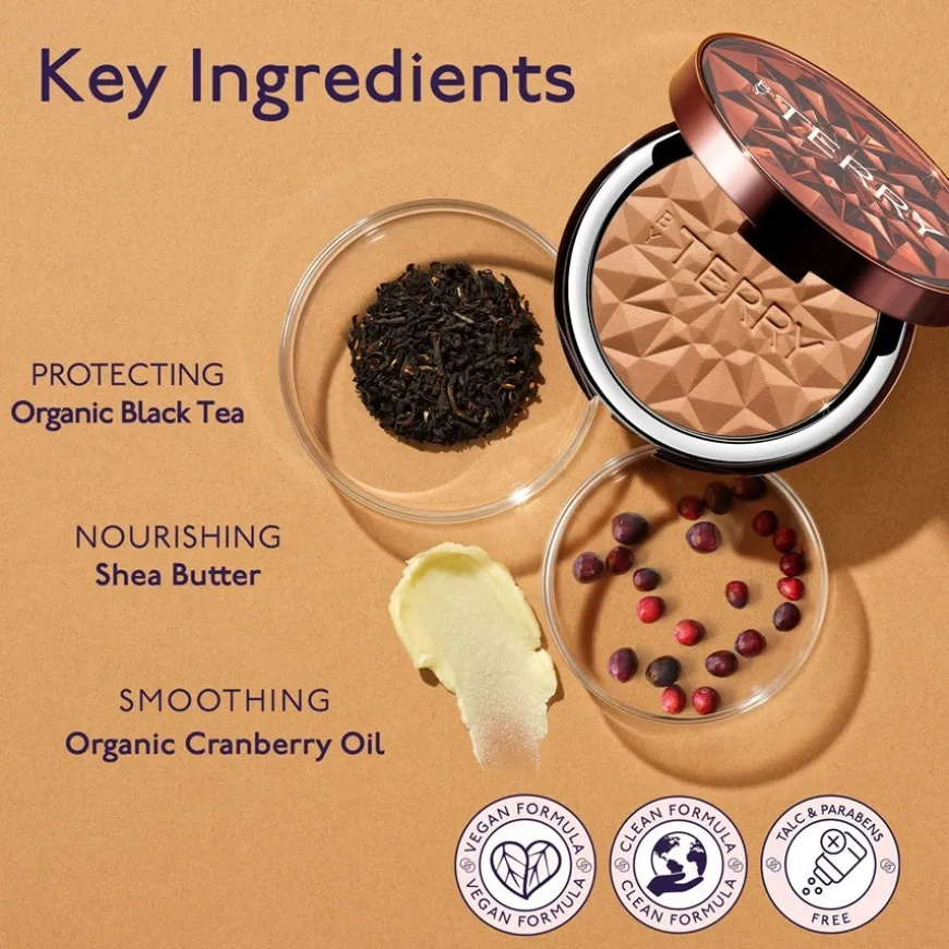 voor je make-up als je waarde hecht aan gezichtsverzorging van hoge kwaliteit. Het poeder is geschikt voor alle huidtypes: Je teint ziet er egaal uit. De Tea to Tan Sun Powder van Terry benadrukt de natuurlijke tint van je huid op een bijzondere manier. Om de nuance van je huidtype op een bijzonder effectieve manier te benadrukken, is het poeder verkrijgbaar in drie bronzen tinten. De matte textuur ziet er natuurlijk uit en combineert prachtig met andere producten voor een perfecte teint.Je ontvangt de Tea to Tan Sun Powder by Terry in een mooi vormgegeven blik met een aantrekkelijke uitstraling. Dit betekent dat je de poeder voor de perfecte teint niet alleen voor jezelf kunt gebruiken: Het is ook het perfecte cadeau voor die speciale gelegenheid. Het product is veganistisch en vrij van parabenen.
