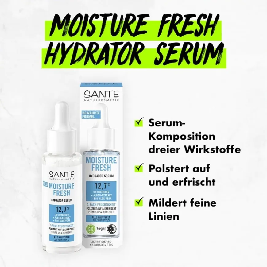 Waardevolle actieve ingrediënten gecombineerd in een serum voor huid- en gezichtsverzorging – het Moisture Fresh Hydrator Serum van Sante Naturkosmetik