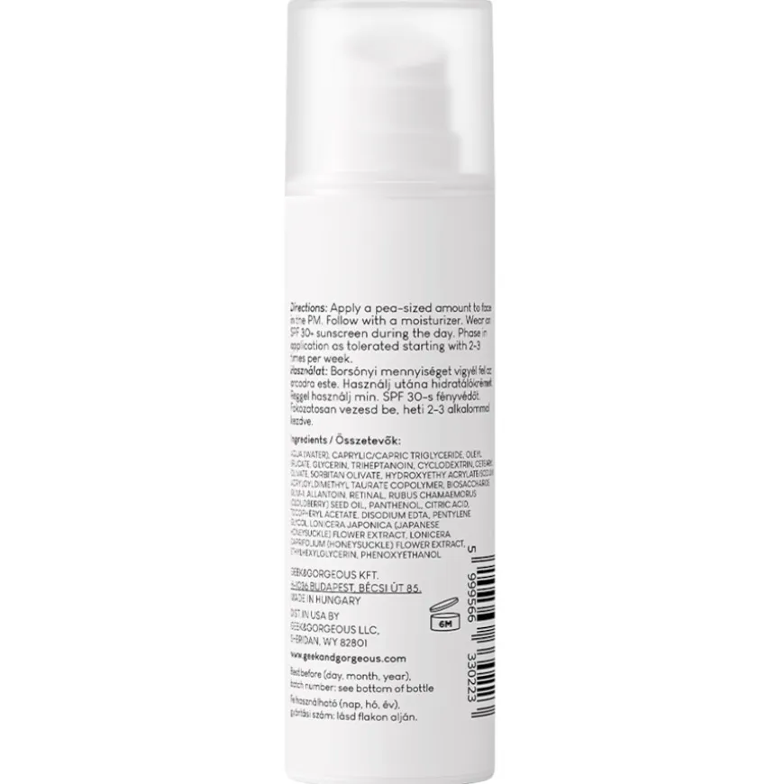 Retinal wordt beschouwd als de grote broer van retinol, maar heeft maar één stap nodig in plaats van twee om omgezet te worden in het huidactieve retinoïnezuur – wat betekent dat het zijn huidverzorgende effecten nog efficiënter afgeeft. Eenmaal op de huid zorgt het Geek & Gorgeous 101 Actives A-Game 10 Serum voor meer collageenproductie en ondersteunt het de vernieuwingsprocessen van de bovenste huidlagen. Dit maakt de teint egaler, helpt oneffenheden voorkomen en zorgt ervoor dat de huid er constant gerevitaliseerd en verjongd uitziet. Het serum kan ook hyperpigmentatie en oneffenheden in de teint verminderen. Door de celvernieuwing te versnellen, heeft het ook krachtige antiverouderingseffecten.