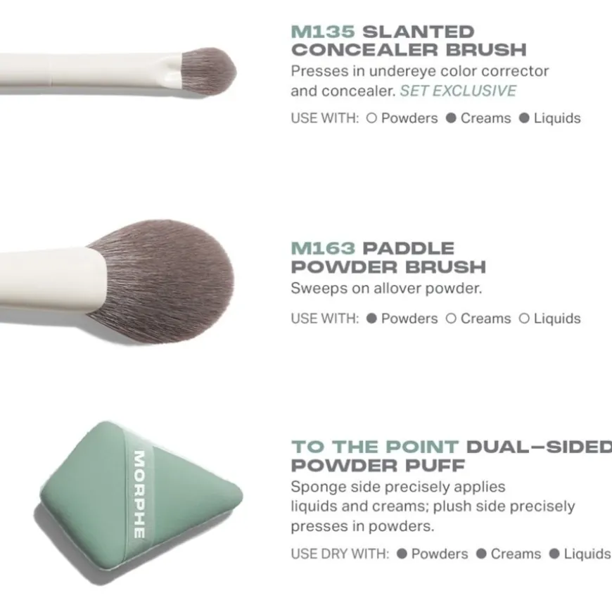 Morfe gezichtskwastensets zoals de Conceal & Set Tool Trio helpen je om de kwaliteit van je make-up naar een hoger niveau te tillen. Deze set make-up tools bestaat uit een concealerkwast, een poederkwast en een poederspons die aan beide kanten gebruikt kunnen worden. Gebruik de Paddle Powder Brush M163 om losse gezichtspoeder aan te brengen op het voorhoofd, de kin, de wangen en de neusbrug. Voor creamy en vloeibare concealer kun je de Slanted Concealer Brush M135 gebruiken. Het mengt de vloeistoffen perfect en geeft je gezicht een harmonieuze omlijsting. De To the Point Dual-Sided Powder Puff is geschikt voor elke poedertextuur en bereikt dankzij de taps toelopende vorm aan beide zijden ook delen van de huid die moeilijk te bereiken zijn met vergelijkbare sponsjes. Dankzij de speciale, zijdezachte band kan de spons precies over de gezichtshuid worden geleid.