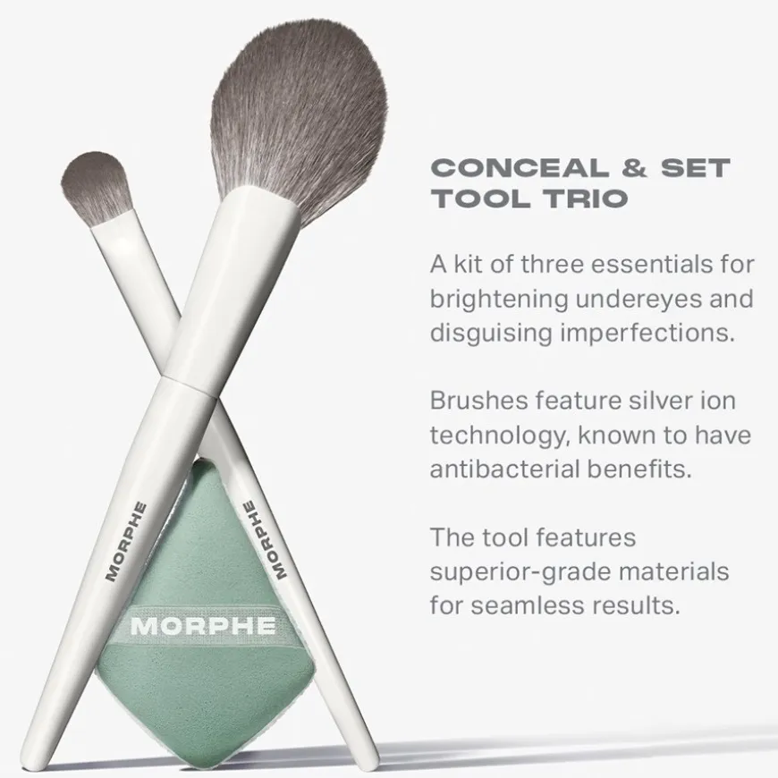 De Conceal & Set Tool Trio uit de Morphe gezichtskwastensets is vervaardigd op basis van ionentechnologie voor effectieve make-up. Hierdoor hebben de gezichtskwasten in de set antibacteriële eigenschappen. Ze remmen de verspreiding van ziektekiemen, zodat je Morphe Conceal & Set Tool Trio altijd hygiënisch schoon en veilig te gebruiken is bij voortdurende verzorging.