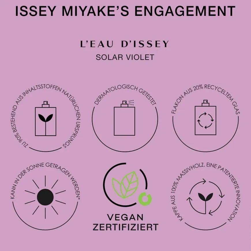 L’Eau d’Issey Solar Violet is een compositie die bloemige en fruitige noten harmonieus combineert. De geur opent met een sappige perennoot, die zorgt voor een duidelijke en aanwezige frisheid. Het gelijknamige viooltje ontvouwt zich in het hart, waarvan de poederachtige facetten de Eau de Toilette Intense zijn karakteristieke en moderne uitdrukking geven. De irisbasis rondt de geurcompositie zacht af en laat een zacht gevoel achter. Het parfum bestaat voor 90% uit ingrediënten van natuurlijke oorsprong en is veganistisch. De flacon zelf volgt het kleurenschema van het viooltje en wordt gecompleteerd door een dop in houtlook, die de verbinding met de natuur weerspiegelt.