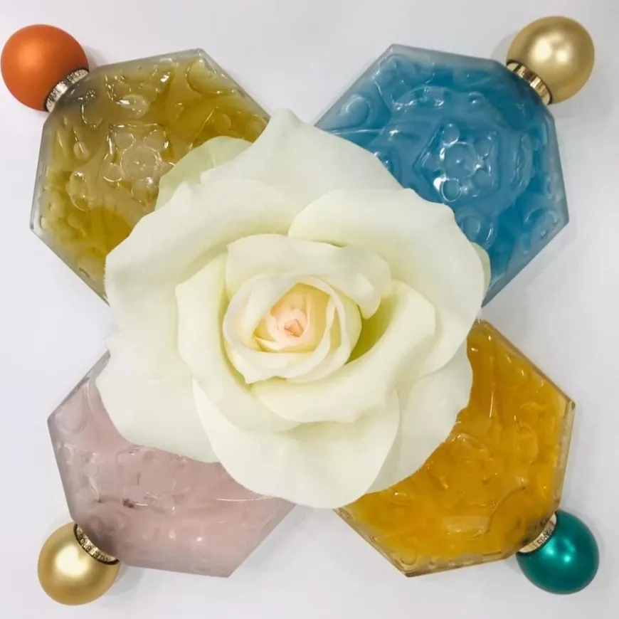 fresia, jasmijn, mango, perzik, roos