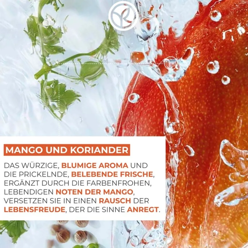Yves Rocher Research for Plant Cosmetics heeft voor deze lijn twee bijzondere geurcomponenten gecombineerd: Koriander en mango. Koriander staat bekend om zijn vitaliserende eigenschappen. De rijke etherische olie van koriander wordt gewonnen uit de bolvormige, knapperige vruchten. De bloemige, kruidige geur en verkwikkende frisheid worden afgerond door de vrolijke, fruitige smaken van mango.