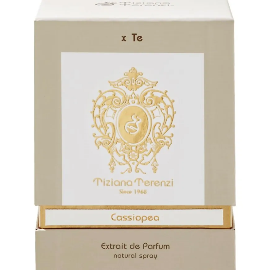 gedachten aan de ruïnes van een oud kasteel, zelfverzonnen sprookjes en de fluweelblauwe zwartheid van een sprankelende zomernacht. De topnoot van het extrait de parfum heeft een fruitige, frisse geur van passievrucht, citroen, zwarte bes en varen. In het hart overheersen de zoete smaken van lelietjes-van-dalen, theeroos en kruidnagel. In de basis sluiten warme noten van sandelhout, tonkaboon en muskus Tiziana Terenzi’s herinneringen aan “Cassiopea” af.