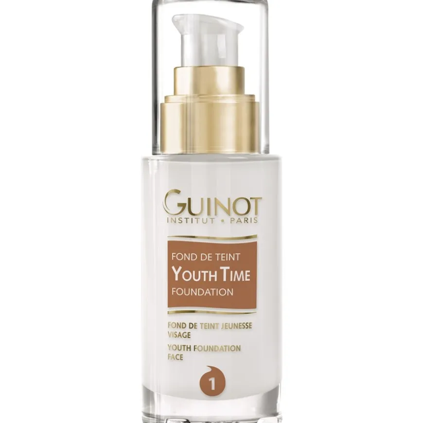 Guinot Fond de Teint Youth Time anti-ageing huidverzorging is ontwikkeld voor de rijpere huid en is geschikt voor alle huidtypes – zelfs de gevoelige huid. De make-up is verkrijgbaar in verschillende tinten zodat je hem perfect kunt afstemmen op je huidskleur en er heel natuurlijk uit kunt laten zien. Het bedekt roodheid, kleine vlekjes, onvolkomenheden, pigmentvlekken en kleurverschillen in de huid, waardoor je een egale teint krijgt die er jonger en frisser uitziet. Guinot huidverzorging is licht en trekt snel in. Het bevat salie-extract, algenextract en wilde rozenolie, die de regeneratie van de huid stimuleren en zorgen voor veel vocht. Je huid voelt soepel en zacht aan, is ontspannen en roos en jeuk worden voorkomen. De huid ziet er voller uit, droogtelijntjes worden verminderd en je teint ziet er egaler uit.Teint Youth Time bevat een zonnebeschermingsfilter dat je huid beschermt tegen schadelijke UV-straling en daarmee tegen vroegtijdige tekenen van huidveroudering.