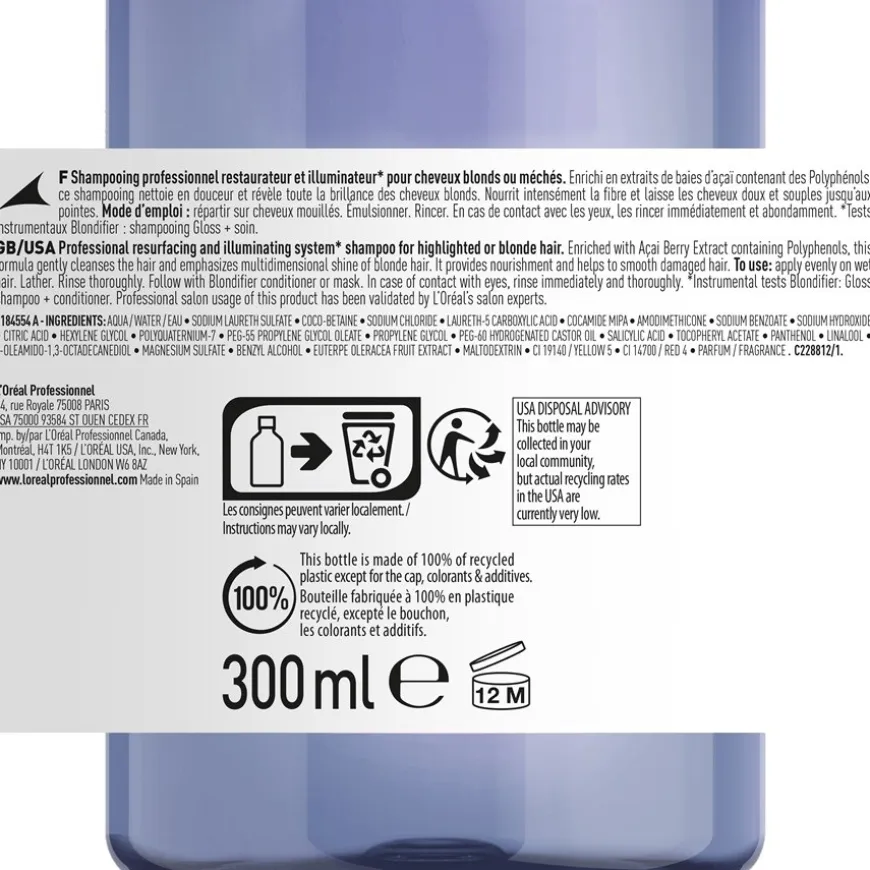 De Blondifier producten van L’Oréal Professionnel brengen een professionele verzorgingservaring binnen je eigen vier muren. Verrijkt met de superfood açai polyfenol, de energieke antioxidant van de açai bes, de glans shampoo regenereert beschadigd haar en geeft het een gezonde, stralende uitstraling. Gevoelig, dof en droog haar wordt mild verzorgd en glanst met een intense, stralende blonde kleur. De shampoo is geschikt voor alle blondtinten.