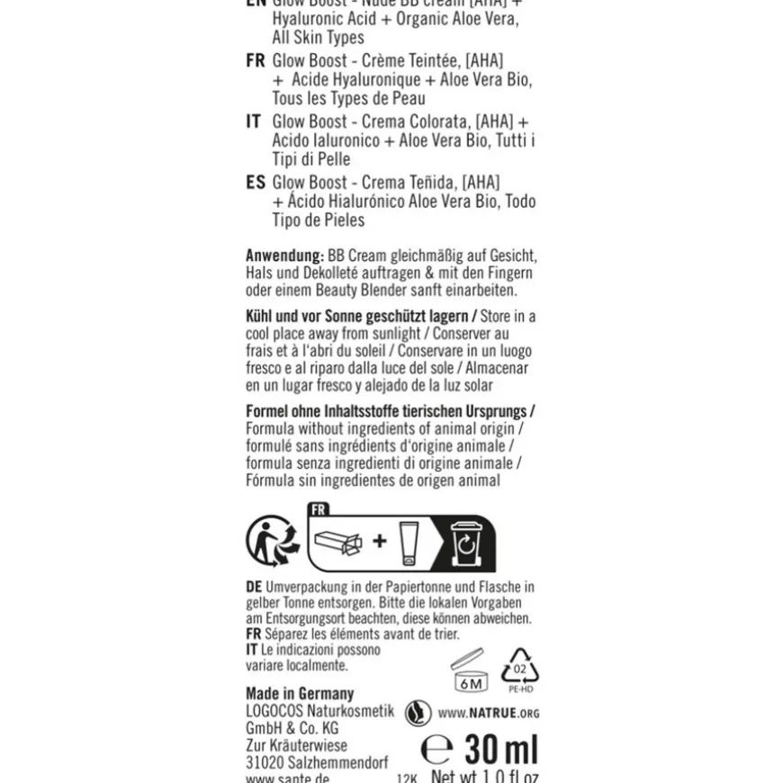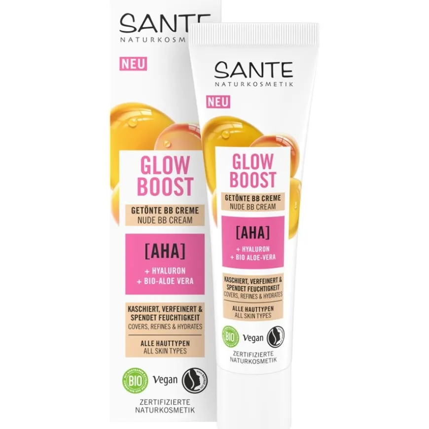 Waardevolle extracten en oliën van zonnebloemen, voedende sheaboter en hydraterende kracht van aloë bieden hoogwaardige huidverzorging met natuurlijke ingrediënten. De formule van Sante Naturkosmetik bevat ook hyaluronzuur en melkzuur, AHA-fruitzuren, glycerine en de antiverouderingsexpert vitamine E. Een geweldige cocktail voor een vitale en goed gehydrateerde huid! Ook veganisten waarderen het verzorgingsproduct, dat vrij is van dierlijke ingrediënten. Natuurlijk biedt het aangenaam geurende BB product ook gecertificeerde biologische kwaliteit. Probeer nu de zacht dekkende GlowBoost getinte BB cream en laat je betoveren door de natuurlijke uitstraling en zachte gloed!