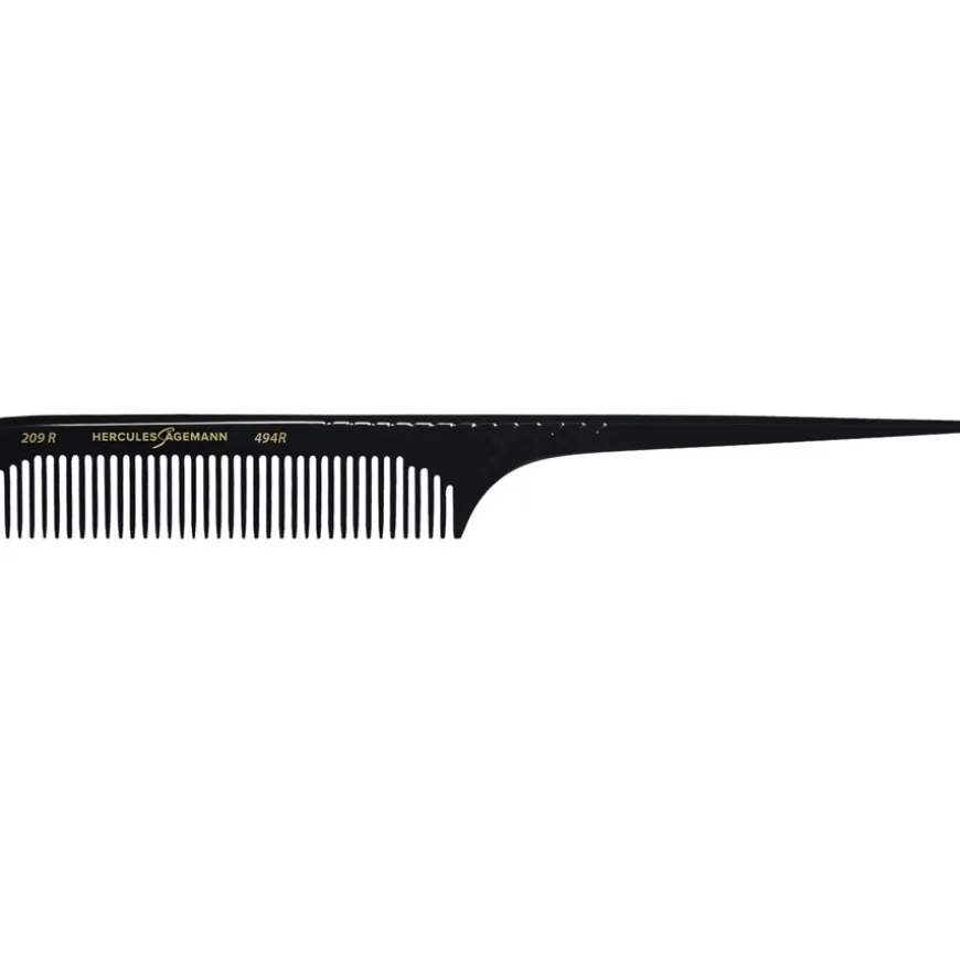 De steelkam model 209R-494R ziet eruit alsof hij uit één enkele mal is gemaakt. Het elegante model is gemaakt van eboniet, een materiaal dat wordt gekenmerkt door bijzonder uitstekende eigenschappen. De flexibele kam ligt comfortabel in de hand bij het stylen van het haar en volgt elke beweging zonder het risico te lopen dat de kam breekt. Het materiaal is ook antistatisch, waardoor het haar niet opgeladen raakt tijdens het stylen. De precies geplaatste tanden zijn licht afgerond aan de punt. Dit vermindert het risico op verwondingen tijdens het kammen en zorgt ook voor een zachte massage van het haar en de hoofdhuid. De naam Hercules Sägemann en het nummer van de betreffende steelkam staan in elegante gouden letters op de bovenkant van de steelkammen.De haarborstels & kammen worden geproduceerd door de New-York Hamburger Gummi-Waaren Compagnie, een bedrijf dat al meer dan 150 jaar actief is op de markt. De fabrikant produceert kappersbenodigdheden en levert zijn modellen aan professionele kappers over de hele wereld.