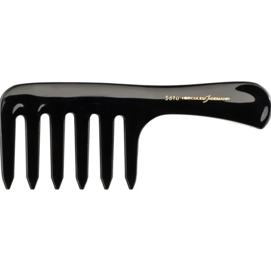 De elegante zakhandvatkam model 5610 is uitgerust met extra brede tanden, die het ook mogelijk maken om bijvoorbeeld het haar te ontwarren. Vooral lang haar heeft hier vaak last van. Het gladde maar flexibele materiaal kamt en verzorgt het haar zacht en geeft het een luxueuze glans. De zacht afgeronde tanden zorgen voor een extra massage van de hoofdhuid. De naam van het label en de productnaam zijn in goud geschreven op het goed gevormde handvat.De haarborstels en kammen van Hercules Sägemann worden geproduceerd door de New-York Hamburger Gummi-Waaren Compagnie (NYH) in Hamburg, een bedrijf dat gespecialiseerd is in de productie van professionele apparatuur voor kapsalons. De kammen met fijne handgrepen en andere producten zijn populair bij professionals over de hele wereld.