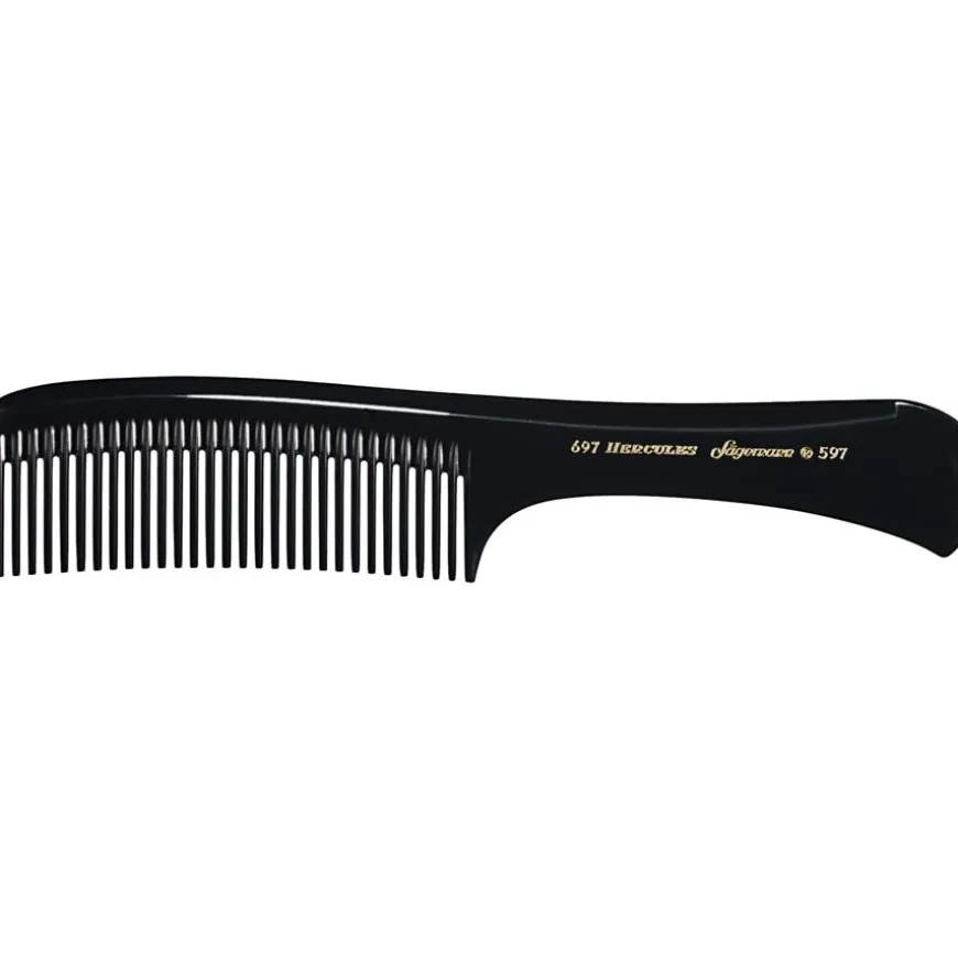 De steelkam model 697-597 is gemaakt van het beste eboniet, een materiaal dat niet alleen extreem flexibel is, maar ook antistatisch. Dit betekent dat je kunt voorkomen dat je haar geladen raakt tijdens het kammen. Tegelijkertijd ziet het kapsel er na het stylen prachtig verzorgd uit en maakt het indruk met zijn zachte glans. De tanden van de steelkammen, die licht afgerond zijn aan de uiteinden, dragen hier ook aan bij. De tanden masseren het haar en de hoofdhuid tijdens het stylen. Denaam en productnaam van het betreffende model staan op de bovenrand van de steelkammen.De fijne haarborstels & kammen van het label Hercules Sägemann worden vervaardigd door de New-York Hamburger Gummi-Waaren Compagnie (NYH) in Hamburg, een bedrijf dat gespecialiseerd is in de productie van apparatuur voor kapsalons. Veel van de producten worden enthousiast gebruikt door professionals over de hele wereld.Bestel de steelkammen en andere producten van Parfumdreams en overtuig uzelf van de hoge kwaliteit en uitmuntendheid van de producten.