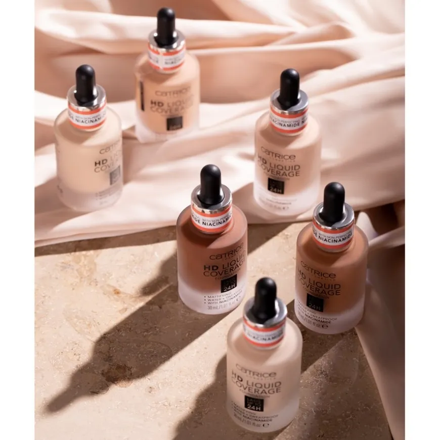 De HD Liquid Coverage Foundation van Catrice breng je aan na je gebruikelijke dagcrème. Tip: Je krijgt een bijzonder egaal resultaat als je daarna een make-up primer gebruikt. Dep de foundation vervolgens op je wangen, voorhoofd en kin en vervaag het met je vingertoppen, een kwast of een sponsje. Dankzij de vloeibare textuur is blenden heel gemakkelijk en kun je lelijke randjes gemakkelijk voorkomen. De teint ziet er meteen matter en egaler uit zonder iets van zijn natuurlijkheid te verliezen. Indien nodig kun je de foundation vervolgens fixeren met losse poeder.
