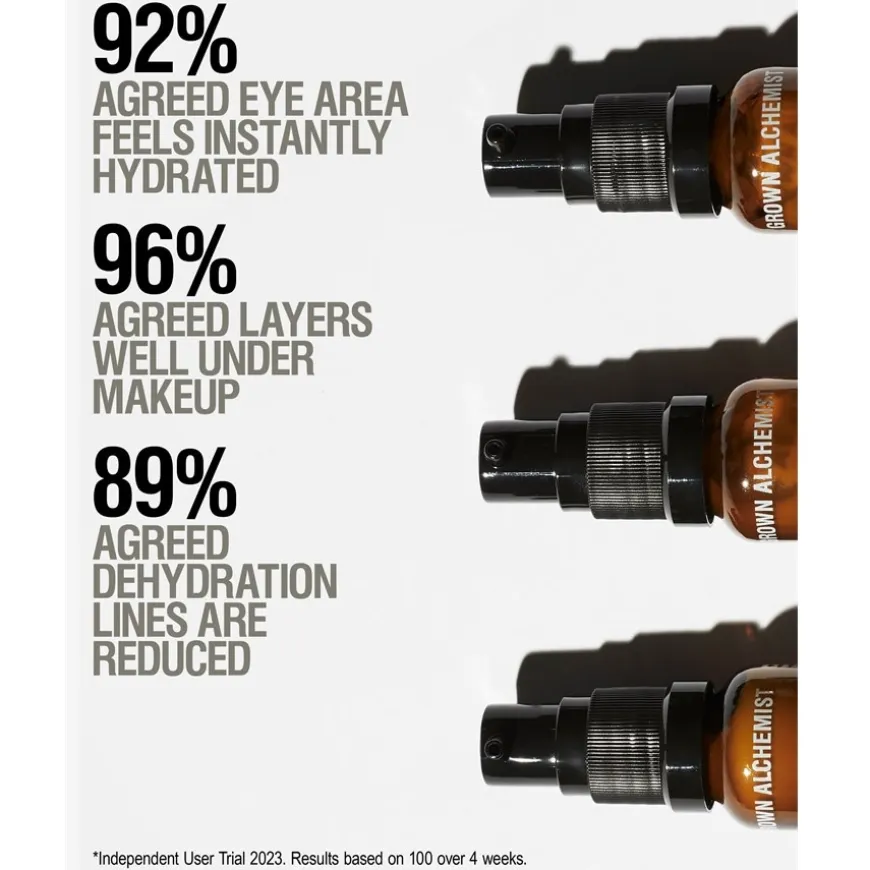 Grown Alchemist Hydra-Restore Eye Serum bevat hyaluronzuur, dat een opvullende en hydraterende werking heeft. Probiotische ingrediënten helpen het huideigen microbioom te versterken en in balans te brengen. Ectoïne is ook opgenomen en voorziet de huid van waardevol vocht, terwijl het tegelijkertijd irritatie verzacht en een licht verhelderend effect heeft, waardoor donkere kringen onder de ogen minder opvallen. De gentiaanwortelextracten in de formule werken als een zeer goed verdragen en natuurlijke fontein van de jeugd, omdat de extracten de oogcontouren definiëren en de huid extra elasticiteit geven. Het serum moet ten minste eenmaal per dag worden aangebracht om het verzorgende effect te maximaliseren.