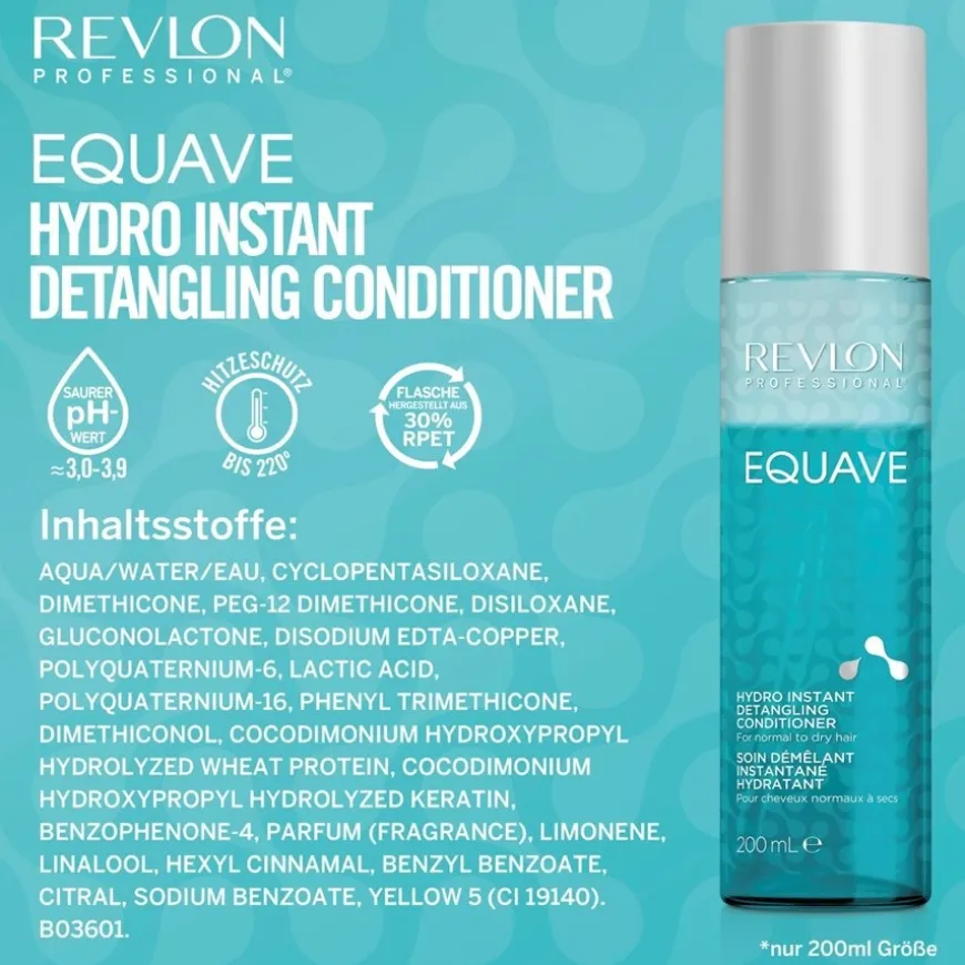 De Equave Hydro Instant Detangling Conditioner van Revlon Professional revitaliseert en herstelt het haar. Dankzij de twee fasen voorziet het het haar van waardevol vocht en essentiële voedingsstoffen. Het ontwart het haar, geeft het elasticiteit en souplesse en verbetert de doorkambaarheid. De formule is de ideale keuze voor normaal tot droog haar. Spray de leave-in conditioner op het haar en spoel het niet uit. Geniet van heerlijk luchtig, zijdezacht en moeiteloos handelbaar haar met een dromerige glans!