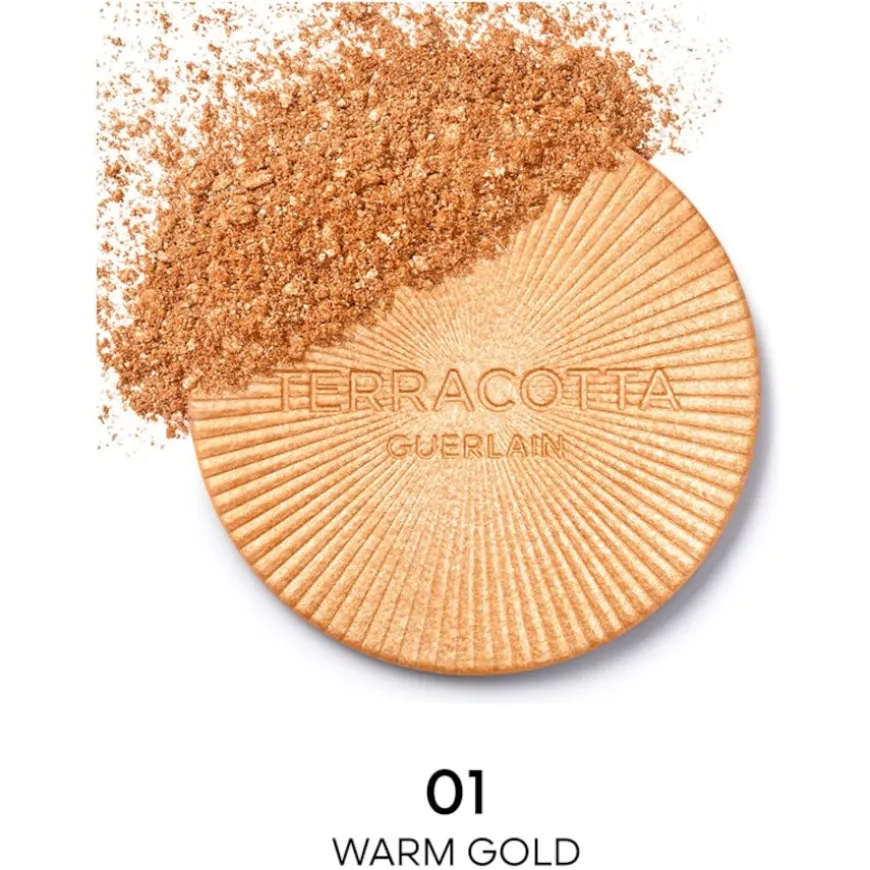 Geïnspireerd door het gouden licht van de ondergaande zon, geeft de Terracotta Luminiser Highlighter van Guerlain de teint een stralende finish. De formule bestaat voor 96% uit ingrediënten van natuurlijke oorsprong en is verrijkt met natuurlijke arganolie. De lichte, smeltende poedertextuur bedekt de huid als een delicate sluier en zorgt voor een comfortabel gevoel gedurende de hele dag. De tint nr. 01 Warm Gold combineert glinsterend roze ivoor met honinggeel goud. De fijnste parelmoerdeeltjes met multidimensionale reflecties vangen het licht en creëren een subtiele, gouden glans voor een natuurlijk ogende gloed. De highlighter kan zowel over foundation als direct op de huid worden aangebracht om individuele accenten te creëren.</p