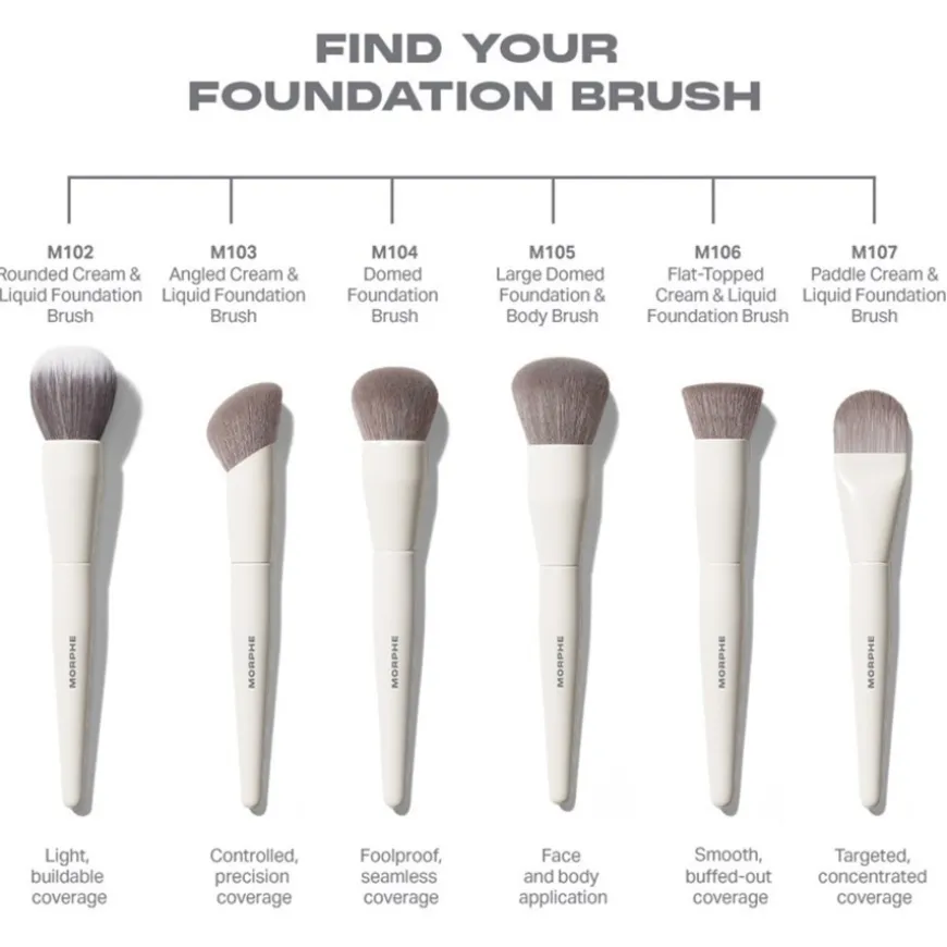 Ontdek de M104 Domed Foundation Brush van Morphe. Dit is een fundamenteel make-up gereedschap voor een perfecte teint. Deze speciaal ontworpen gezichtskwast tilt het aanbrengen van vloeibare en crèmige foundation naar een nieuw niveau, want het geheim zit hem in de strak gebonden, zacht afgeronde, koepelvormige haren. Deze hoogwaardige synthetische vezels glijden zijdezacht over de huid en zorgen voor een absoluut naadloze, streeploze blending.