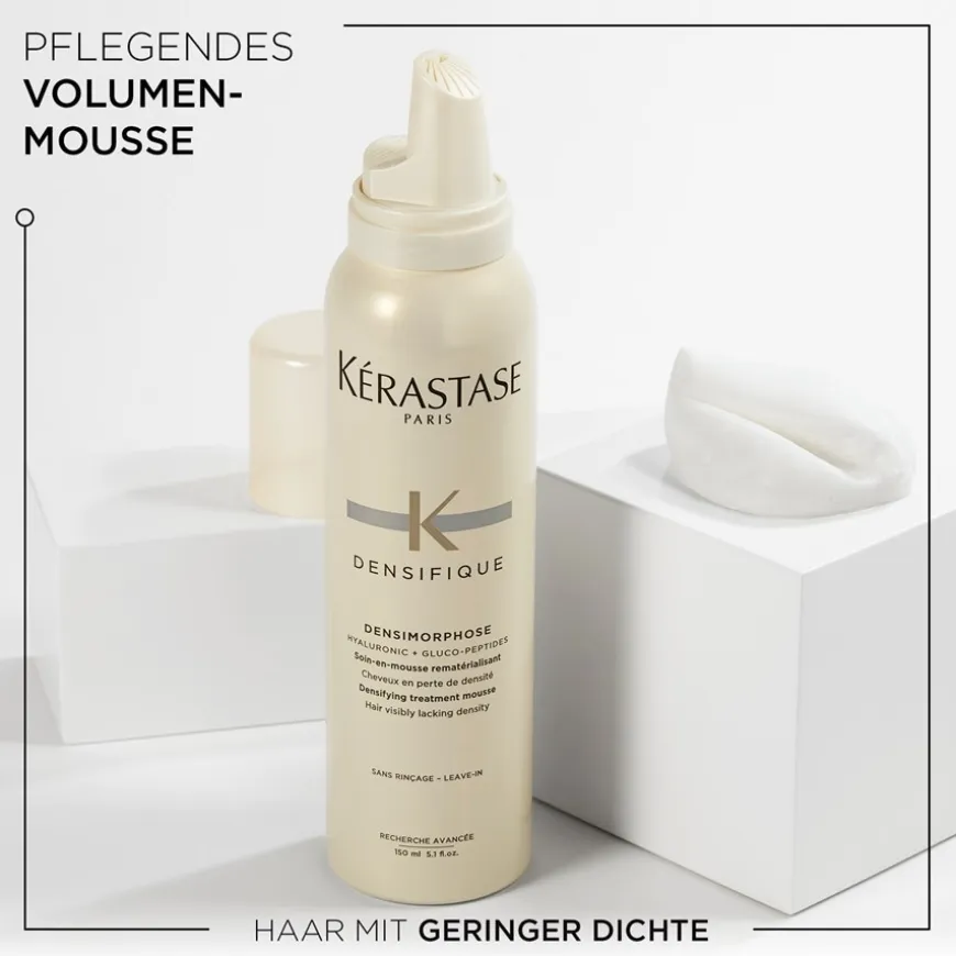 Werkzame ingrediënten:</h2De voedende Densimorphose mousse van het cosmeticamerk Kerastase by L'Oréal is een aanvulling op de regenererende en herstellende haarverzorging met Densifique. Het hyaluronzuur in de mousse hydrateert de hoofdhuid, creëert een optimale groeiomgeving en voorziet het haar van vocht. Het haar wordt gevoed, gekalmeerd en krijgt soepelheid en nieuwe vitaliteit. De gluco-peptiden hechten zich aan het haar, optimaliseren de oppervlaktestructuur en bevorderen de haargroei. De ceramiden versterken de haarvezels. De textuur van de volumemousse dringt snel door in de haarvezels en maakt het haar onmiddellijk dikker en gladder. Toepassing: