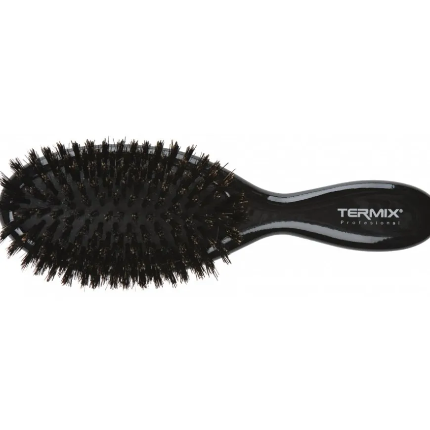 .Het cosmeticalabel TERMIX heeft de borstels met dicht everzwijnhaar niet alleen ontworpen voor het ontklitten van droog haar. Gebruik de ontklittende borstels om je veeleisende haar te verzorgen tijdens de dagelijkse styling. Borstelbeweging voor borstelbeweging, je zult de verbeterde grip van je haar voelen, dat een blijvende natuurlijke glans zal hebben. Gebruik de kleine of grote paddleborstel van everzwijnhaar van het cosmeticabedrijf, dat over de hele wereld bekend staat om de productie van eersteklas borstels voor professioneel gebruik, als verzorging voor je haar. Tot slot is ook het uiterlijk van de ontklittende borstel in de kleur zwart, waarvan het handvat net zo ovaal is als de borstelkop met de borstelharen, indrukwekkend.